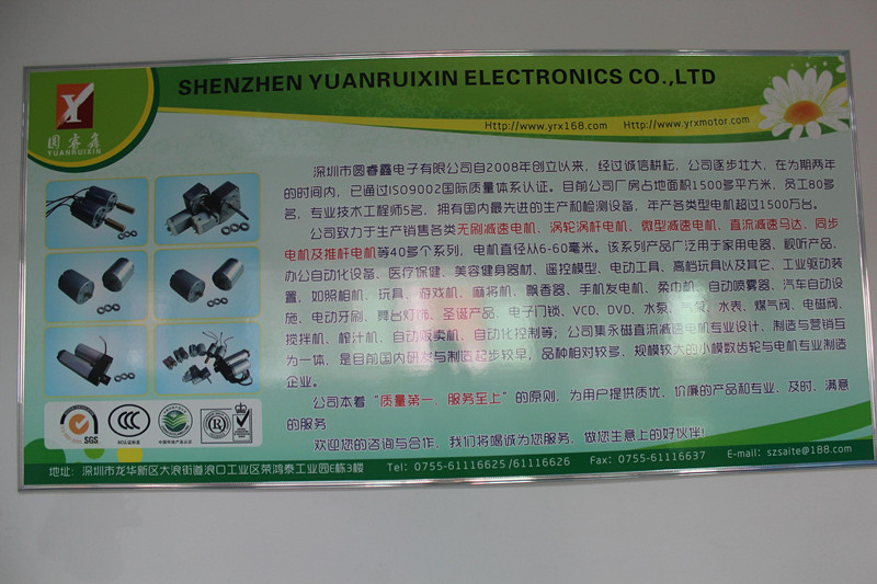 深圳市圓睿鑫電子有限公司自2008年創(chuàng)立以來(lái),經(jīng)過(guò)誠(chéng)信耕耘,在為期兩年的時(shí)間內(nèi),已通過(guò)ISO9001:2000國(guó)際質(zhì)量體系認(rèn)證。公司廠房占地面積2000多平方米,員工100人,專(zhuān)業(yè)技術(shù)工程師6名,擁有國(guó)內(nèi)最先進(jìn)的生產(chǎn)和檢測(cè)設(shè)備,年產(chǎn)各類(lèi)減速電機(jī)超過(guò)2~300萬(wàn)臺(tái)。因公司發(fā)展需要,于2020年底,將生產(chǎn)基地遷往擁有最美小鎮(zhèn)之稱(chēng)的東莞市清溪鎮(zhèn),依山傍水,依托美麗的大自然環(huán)境和地方文化,全新的東莞市圓睿鑫電子有限公司將借助深圳母公司平臺(tái),一步步走上新的臺(tái)階。